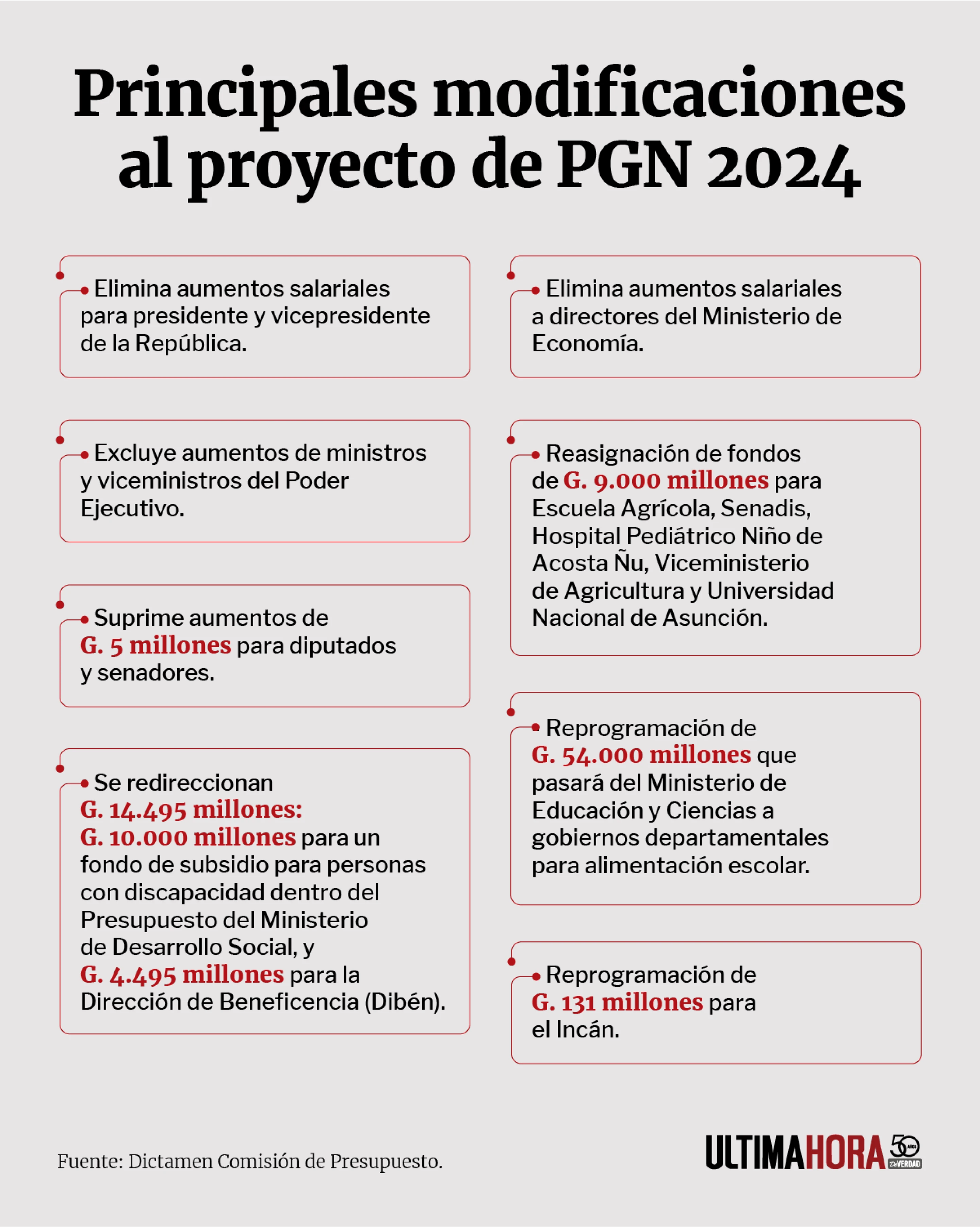 Cobro de factura a Fernández. En el estudio en particular del documento, los diputados decidieron recortar más de G. 9.000 millones al Ministerio de Economía y Finanzas que estaban planificado para el aumento salarial de sus directores, junto con aumento de los viceministros y ministro.